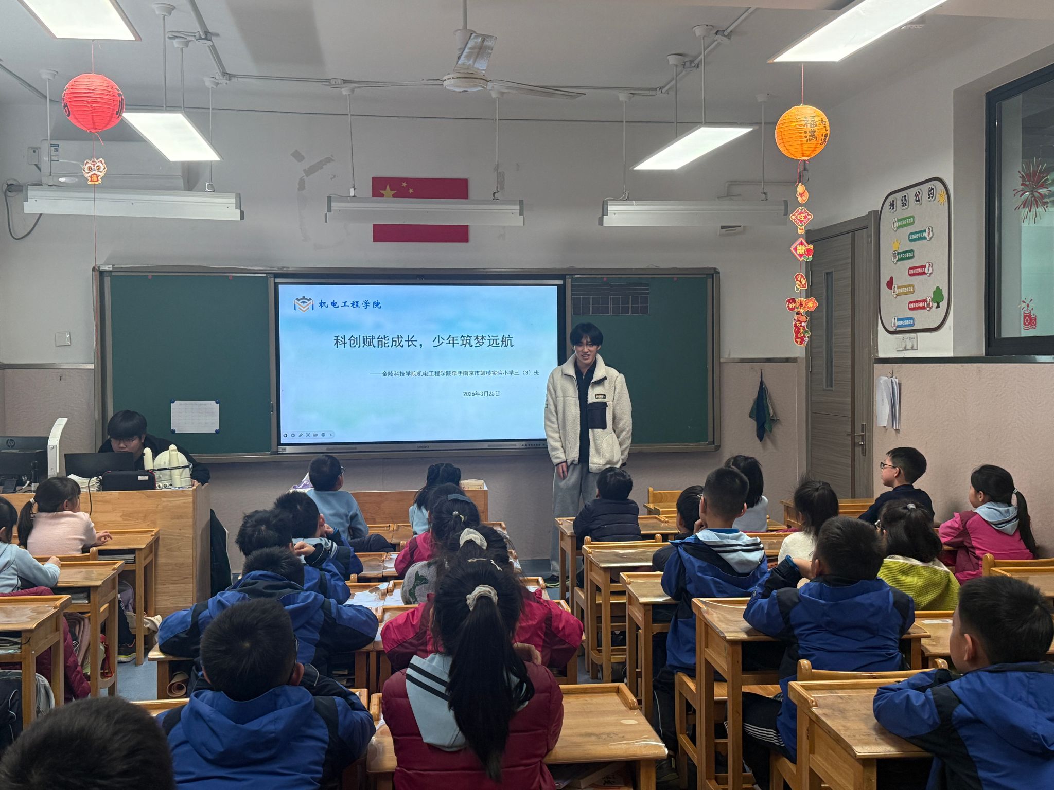 为厚植青少年科学素养,点燃科技创新梦想,3月25日下午,机电工程学院学工办李梅老师带领CR科创团队成员走进鼓楼实验小学,举办 “科创进校园” 系列活动,学生科创团队负责人王玉鹏、赵宇龙为孩子们送上一堂生动有趣的科普实践课。